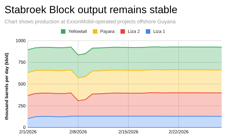 Crude oil production offshore Guyana averaged about 918,000 barrels per day (b/d) in February 2026, reflecting continued gains from optimization work across ExxonMobil’s Stabroek Block developments.