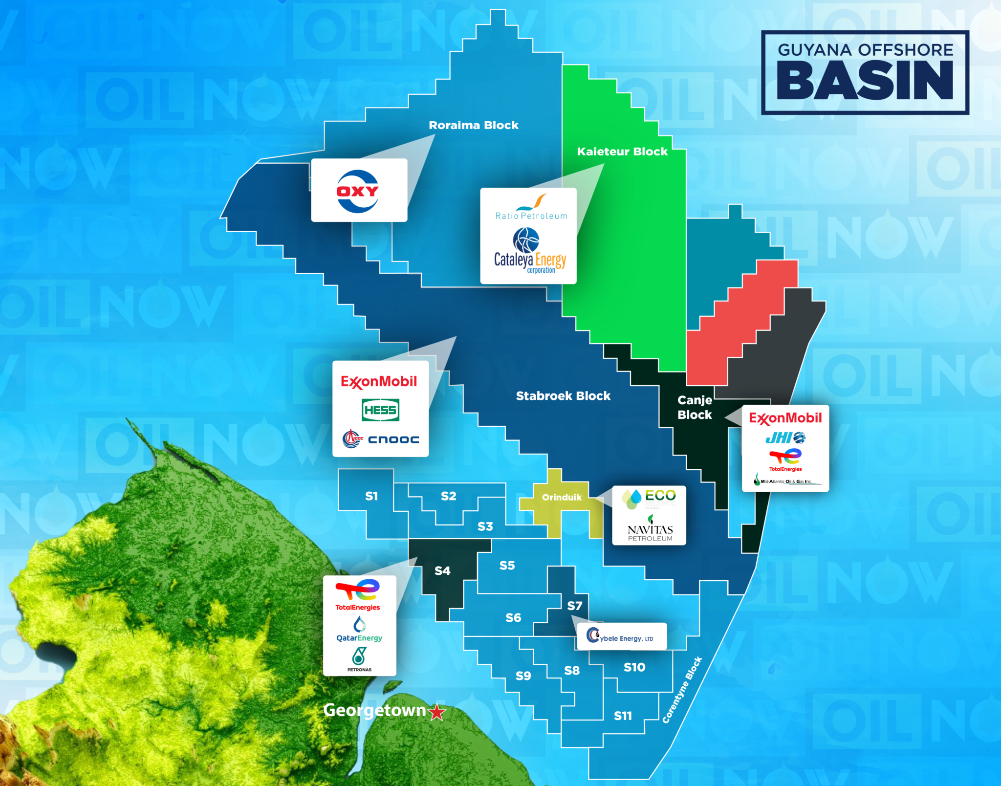 The Roraima Block is held by Occidental. Nearby, the Orinduik Block is operated by Eco Atlantic Oil & Gas in partnership with Navitas Petroleum, with multiple discoveries already reported and appraisal work ongoing.